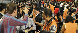 Saturday evening was dedicated to a Gospel crusade to reach the lost in Hong Kong. Requiring a complete change in language, a different Cantonese-speaking worship group, and radio transmitters to provide translation for the Mandarin-speaking Chinese delegates, the team worked quickly to make the switch. Reinhard Bonnke preached a clear and forceful Gospel message, and the altar was filled with new converts.