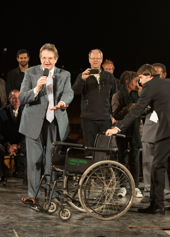 Then Evangelist Bonnke prayed for the sick and mighty miracles began to happen.  The joy of the multitude was uncontainable once wheel chairs and crutches started going up into the air.  One wheelchair landed on the platform, but the former cripple was nowhere to be found.  Witnesses told us that when Jesus healed him, he jumped out of his wheelchair and ran home!